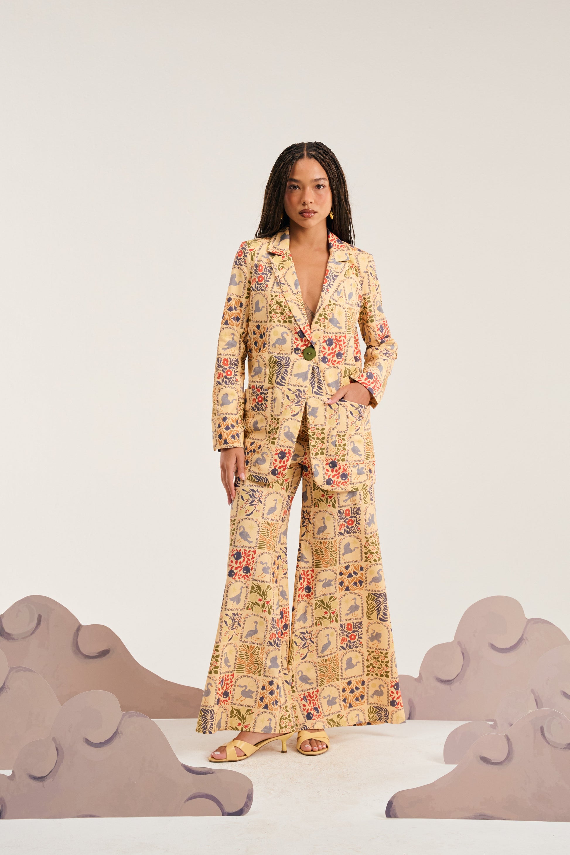 A Calça Nina é uma modelagem amada desde a nossa primeira coleção. Como modelagem wide leg, nossa calça mais vendida está de volta agora em alfaiataria ainda cheia de amplitude e movimento. Possui elástico no cós para maior vestibilidade e caimento único. Nossa estampa autoral de garças oferece leveza e sofisticação que fogem do óbvio sem perder a atemporalidade da alfaiataria.