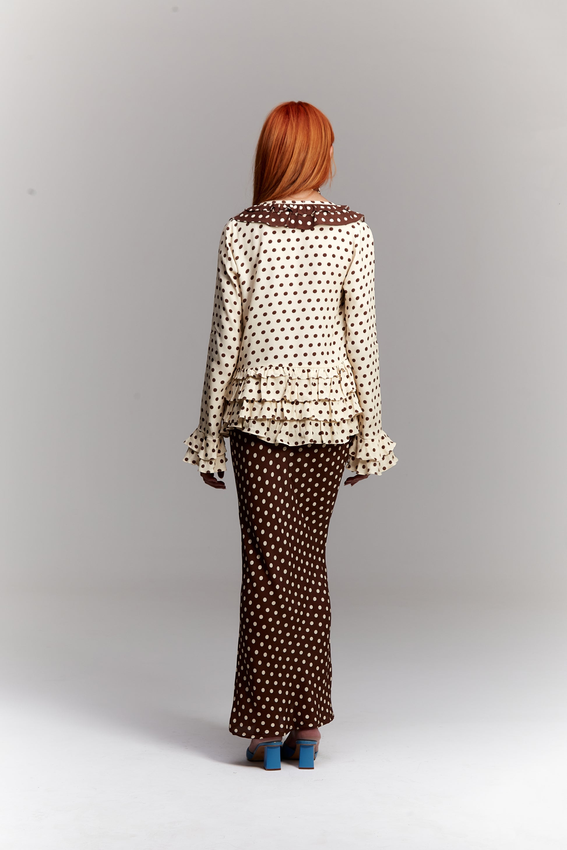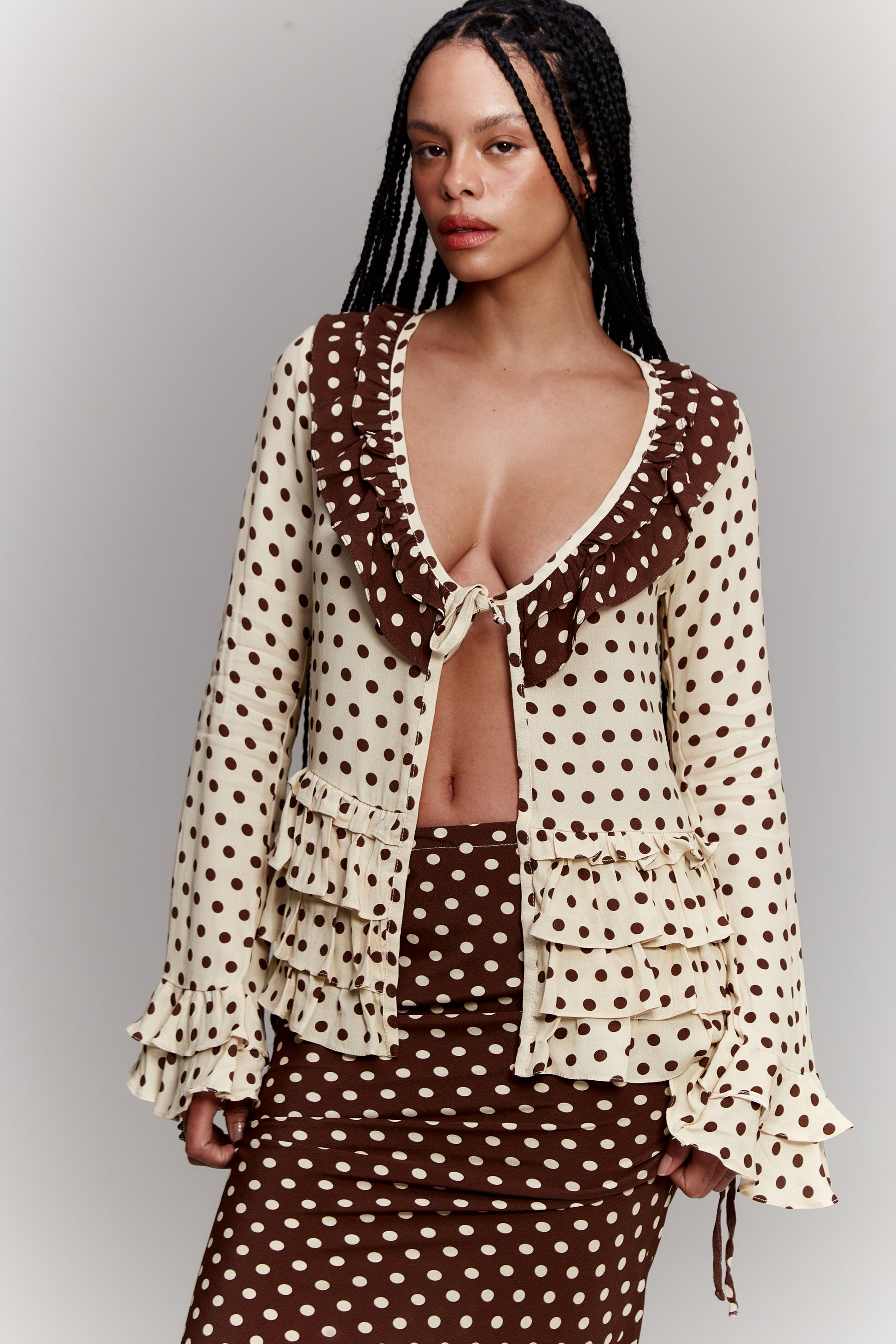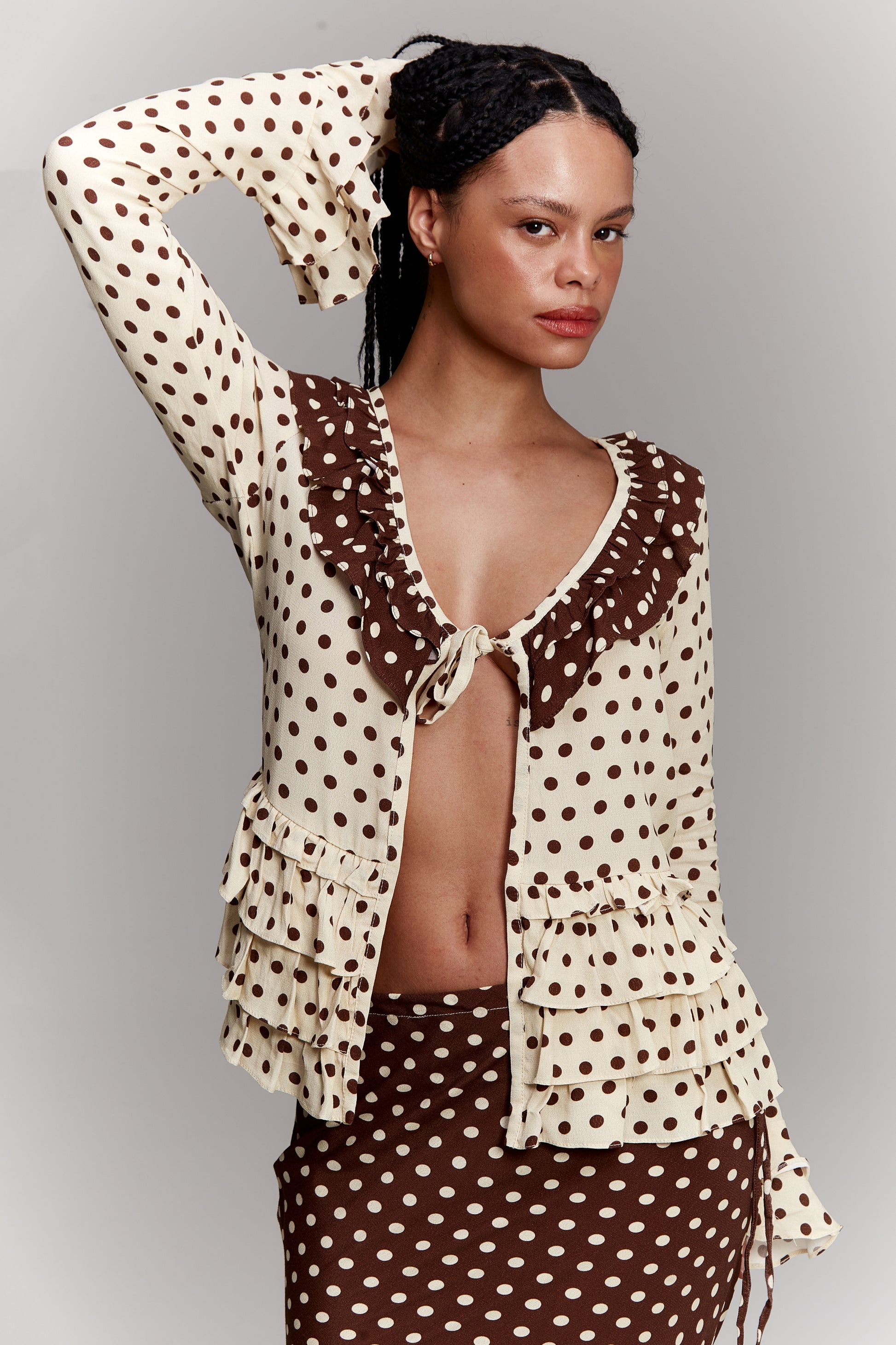 Nosso top número 1 de vendas, Tuca, voltou na sua versão em poá. Com sua modelagem que caminha entre o sexy e o delicado, ele possui amarração no decote frontal, podendo ser usado como sobreposição abertinha. Nessa sua releitura, apostamos no mix entre duas variações de poá que exalam sofisticação e autenticidade.