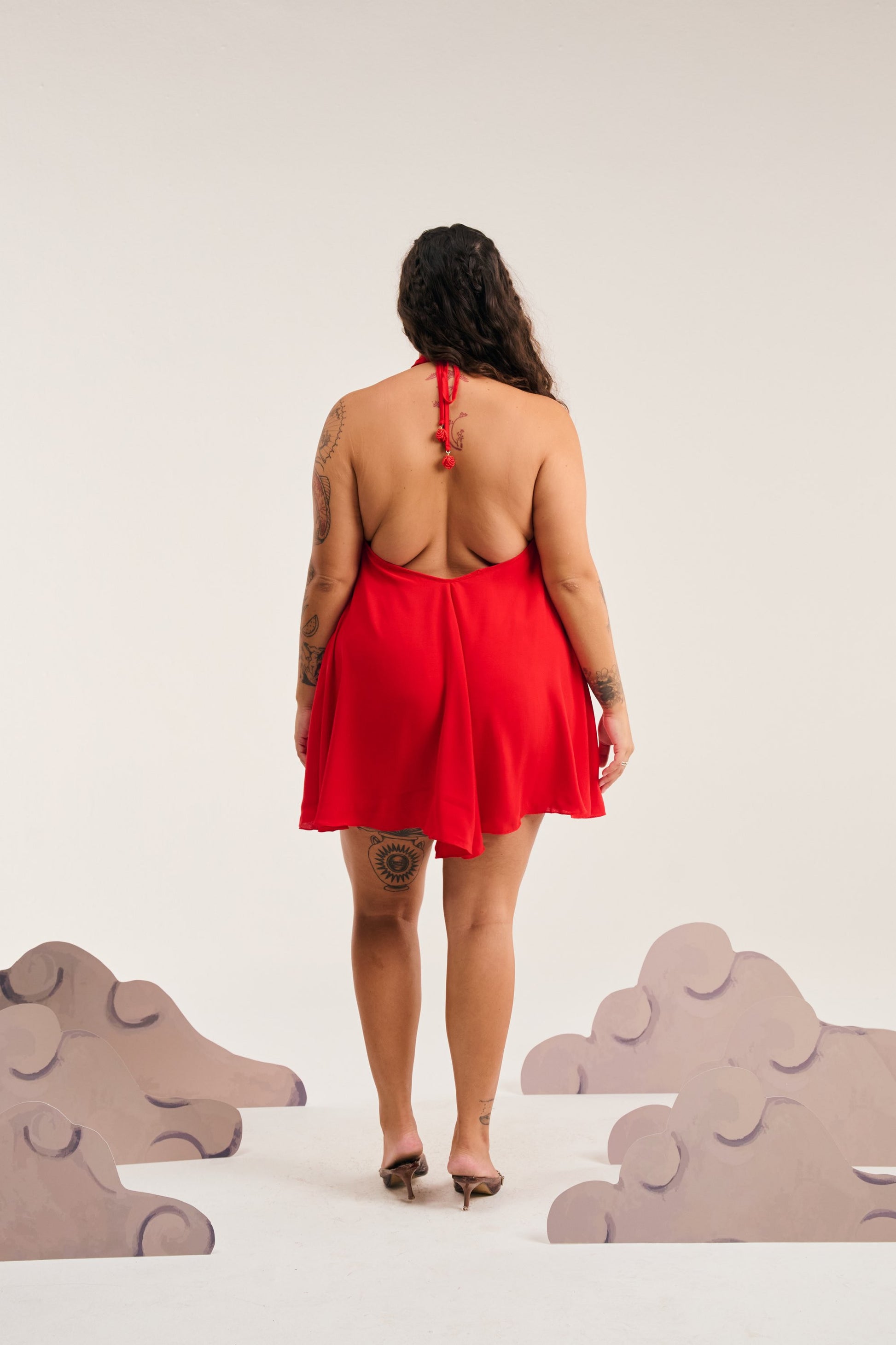 Nosso vestido Clara é a pedida sexy e fresquinha pra te acompanhar do dia até a noite - na cor Vermelho Roseira e em tecido de crepe leve e encorpado ele é o curtinho perfeito. Possui decote nas costas com amarração na nuca com ponteiras de rosas em miçanga - para dar o toque Nuska nos detalhes.