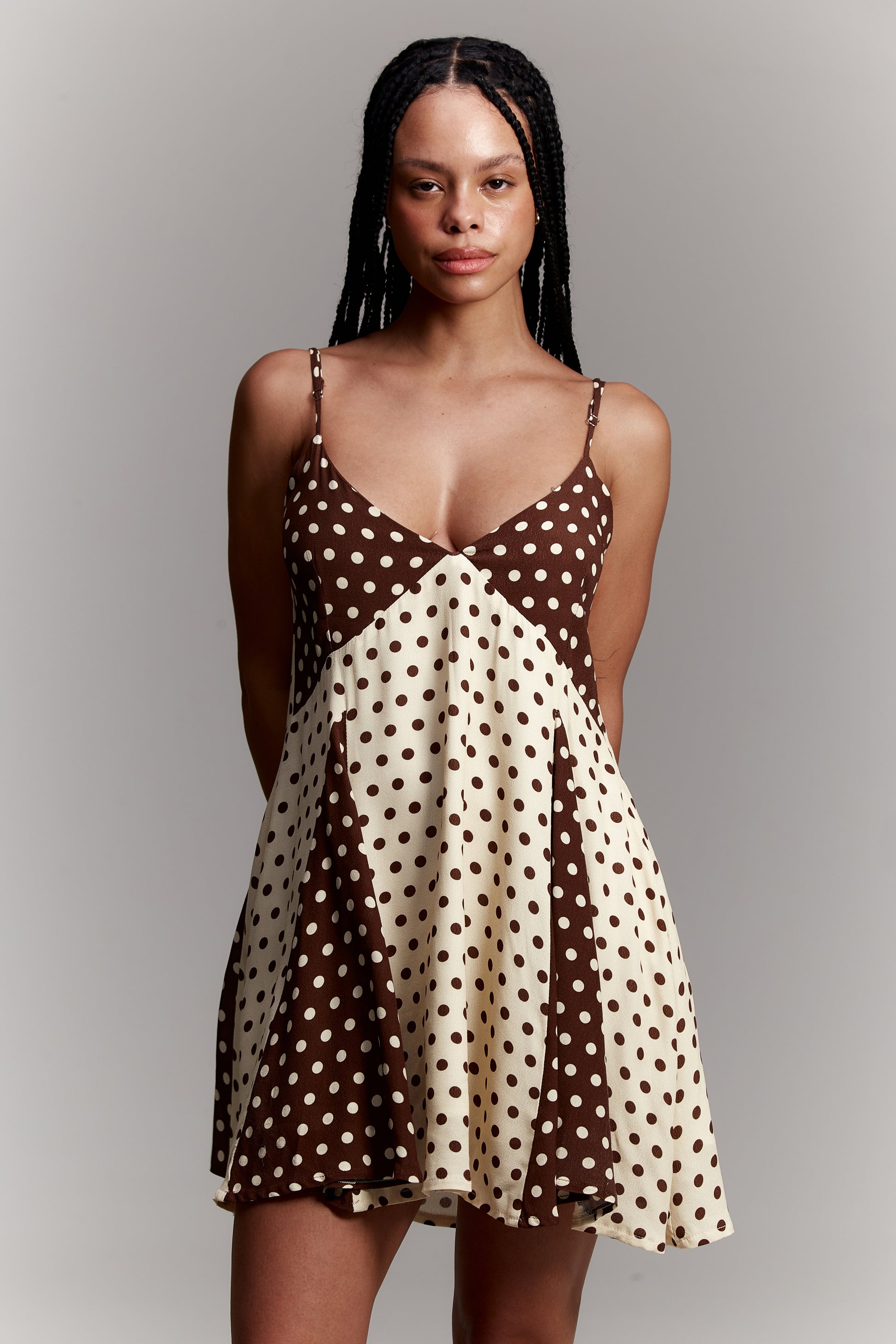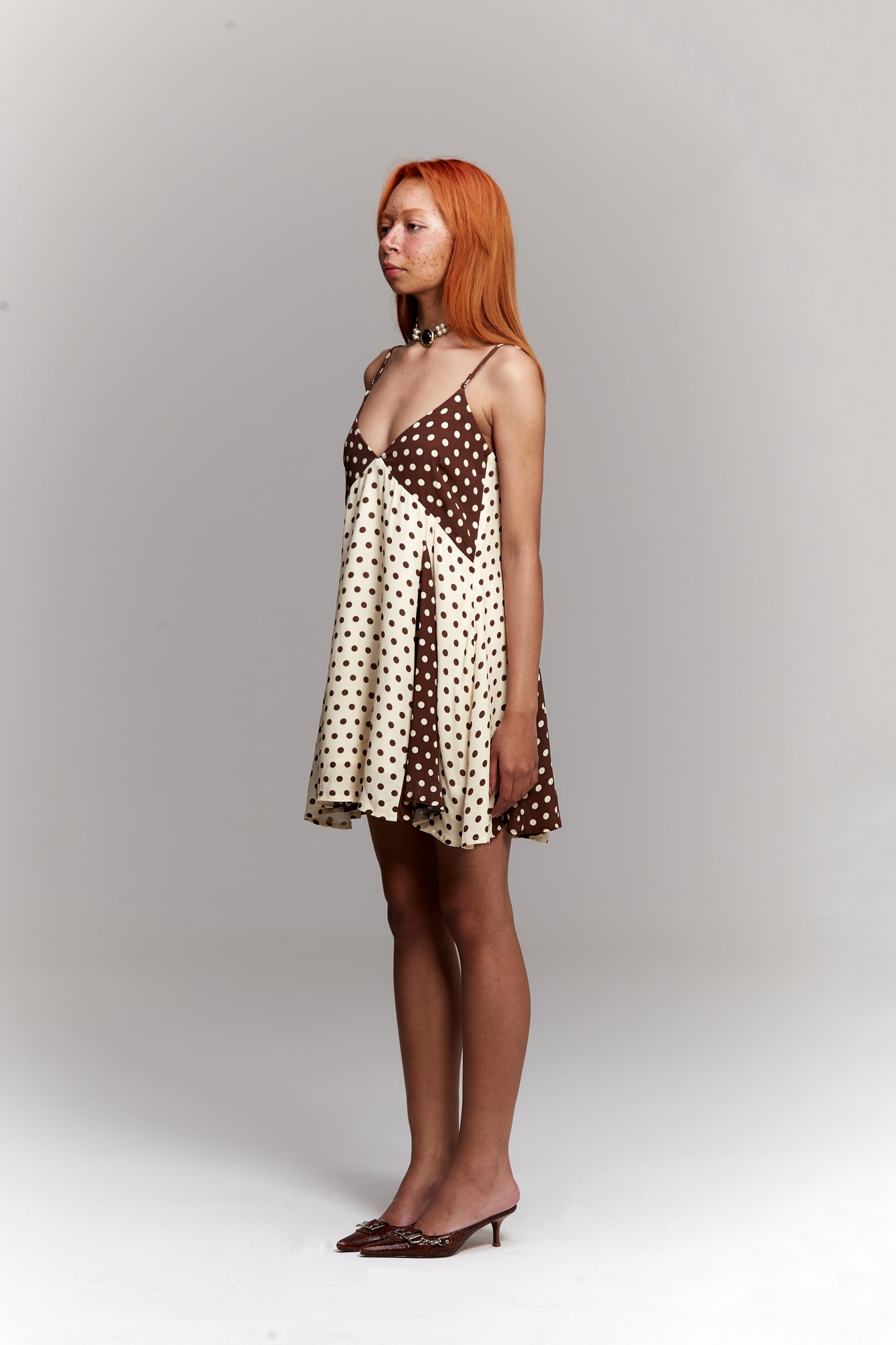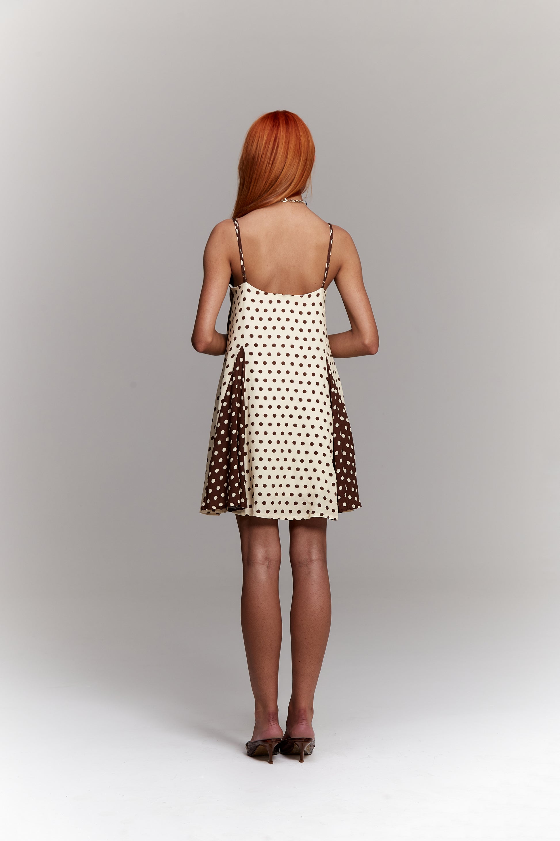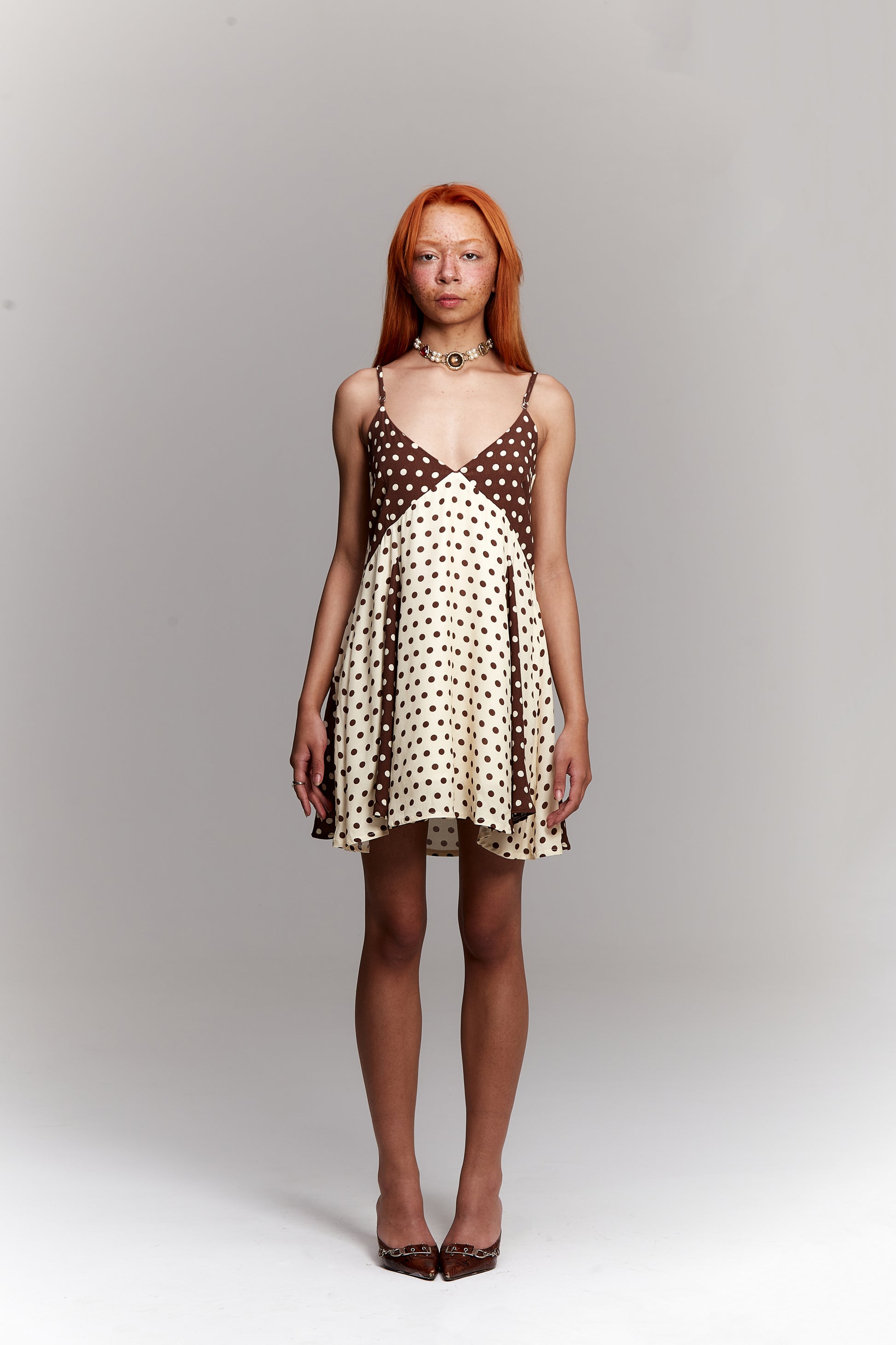 Nosso vestido Paula é rico em detalhes. Todo construído em variação de poá: no corpo exploramos a variação de poá, o busto possui fundo marrom junto dos recortes de nesgas. Movimentação sem igual. Leva forro para evitar transparências e regulagem nas alças.